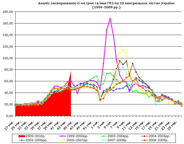 Poniżej wykres (ze strony ministerstwa zdrowia) obrazujący ilość chorych na grypę i infekcje dróg oddechowych w 10 kontrolnych miastach Ukrainy w ciągu ostatnich 10 lat. Na osi x – tygodnie roku, na osi y – ilość chorych. Kolorami oznaczono poszczególne sezony.